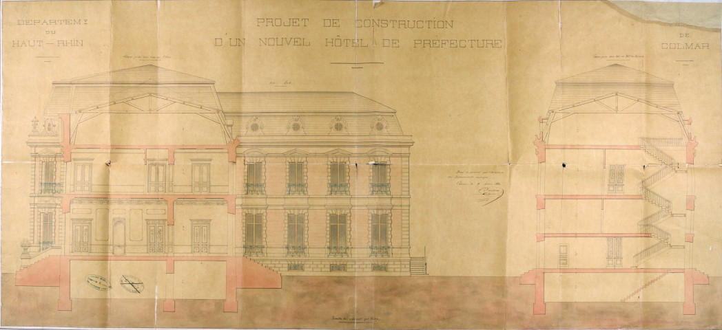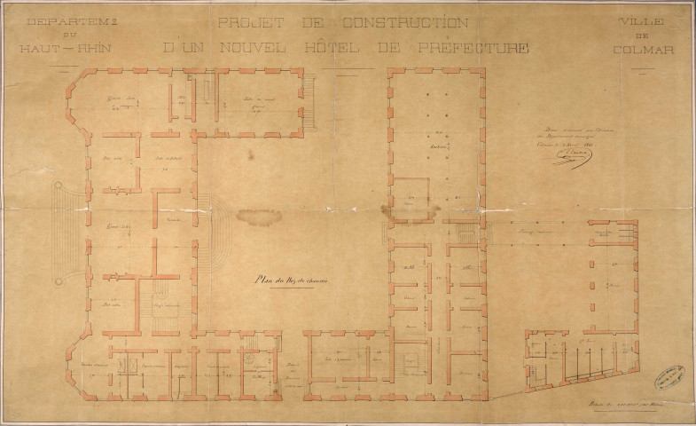 Contient entre autres: 1858 : 5 plans de masse; plan de masse, plan du rez-de-chaussée, plan du premier étage, façade latérale et façade postérieure à l'appui du projet du 5 avril 1860 ; plan de masse, plan du rez-de-chaussée, plan du premier étage, façade latérale et façade postérieure à l'appui du projet du 21 juillet 1860 ; plan de masse, plan du soubassement, plan du rez-de-chaussée, coupes, façade principale et façade postérieure à l'appui du projet du 12 août 1861 . 1859 : plan de la préfecture de Chaumont (Marne) .