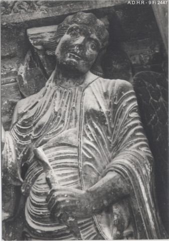 Saint-Gilles (Gard), Cité d'art roman, église abbatiale (XIIe siècle) : portail de gauche, saint Michel