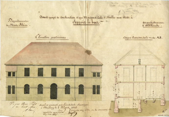 Contient entre autres: coupe et élévation de l'école-halle aux blés (1845); plan et coupes (en 3 feuilles) de l'église (1857).